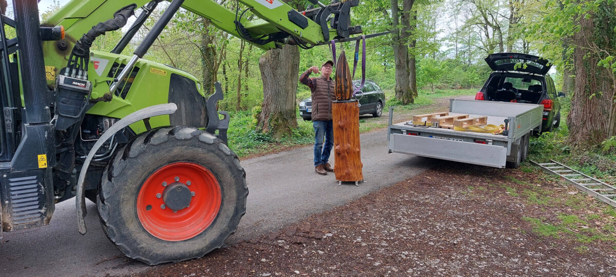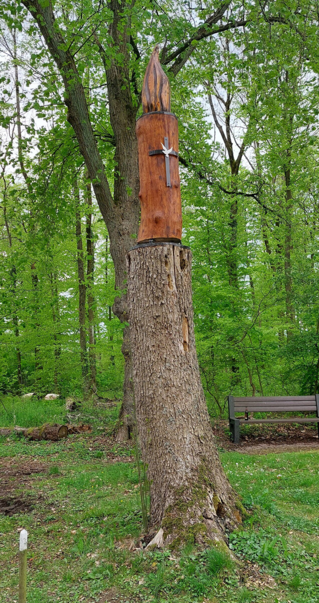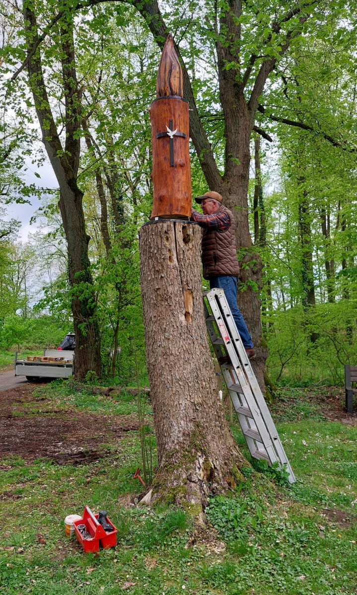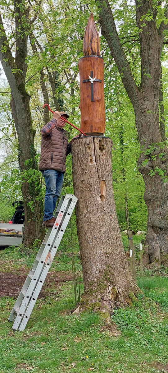 Specht und Co. hatten der Kerzenskulptur auf dem Vorplatz der St. Michalskapelle in den letzten Jahren schwer zugesetzt und dafür gesorgt, daß die Kerze aus Sicherheitsgründen abgebaut werden musste. Hubert Drüke hat sich der Sache ehrenamtlich angenommen, das Kerzenlicht überarbeitet und für einen massiven Unterbau aus Eiche gesorgt. Angesichts der aktuellen Krisen und Kriege war es ihm wichtig, ein „Friedenslicht“ für den Heiligenberg zu gestalten. Heute wurde die neue Skulptur mit Unterstützung von Landwirt „Mokka“ Ahlemeier aus Bosseborn errichtet. Das Ergebnis kann sich wahrlich sehen lassen und kommt zur baldigen Eröffnung der Heiligenbergsaison gerade recht.
