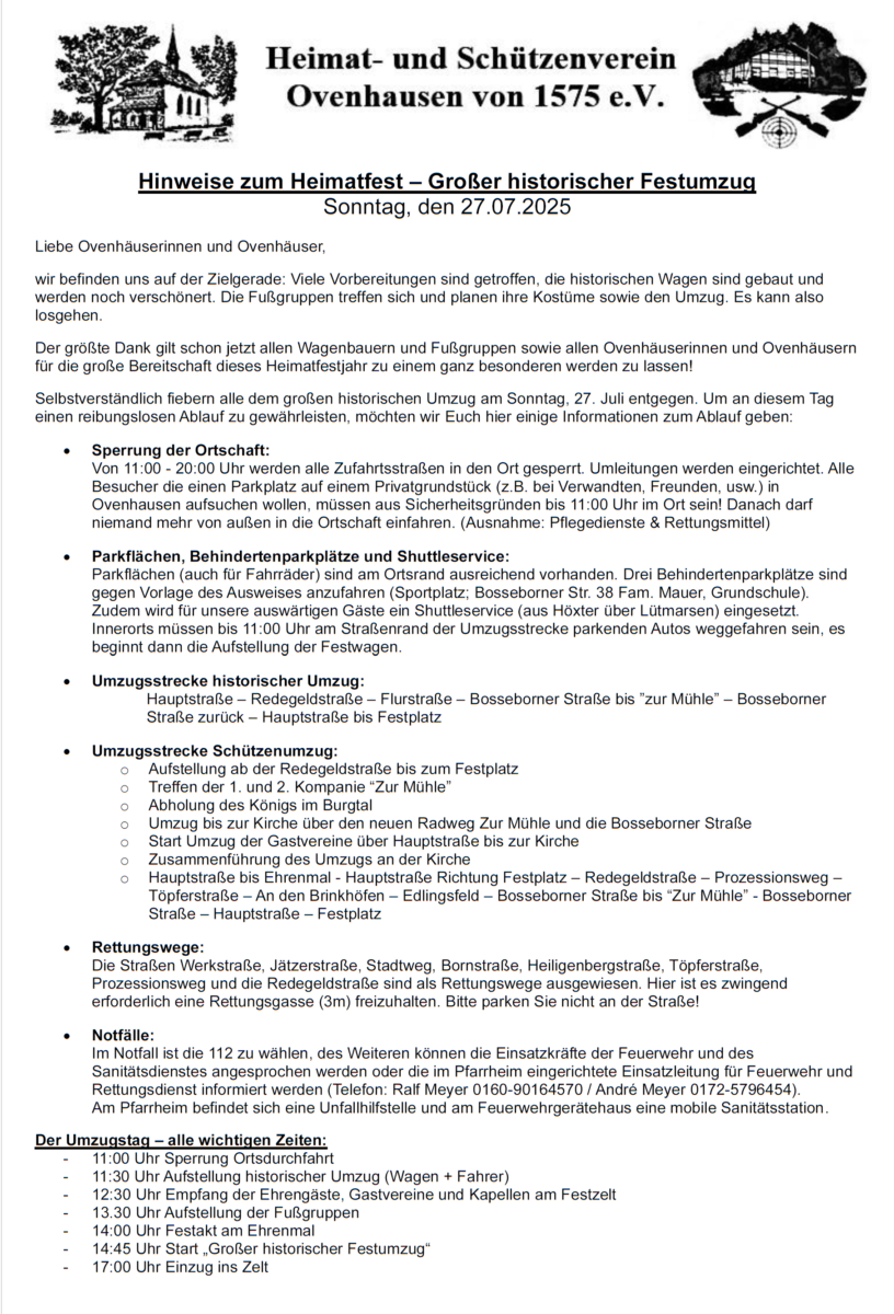 anbei noch einmal die Hinweise für das Heimatfest 2025 welches auch mit der letzten Ausgabe der OWZ verteilt wurde.